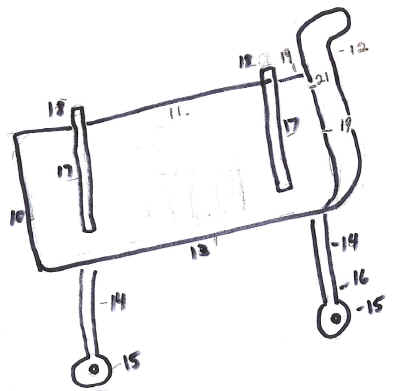 Figure 1: Side view: 10. canvas material surrounding frame 11. mesh pouch for bathing suits 12. handle with soft grip 13. frame of carry-all 14. legs which fold down 15. wheels 16. locking feature for back wheels 17. straps go around top to secure items 18. buckle on straps 19. zipper on front of carry-all, and on top (both zippers lock) 21. lock for carry-all |