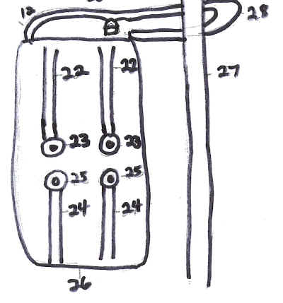Figure 2: Top view: 17. straps 18. buckle or straps 19. zipper along top, sipper in front 20. handle 21. lock on top of carry-all 26. front of carry-all |